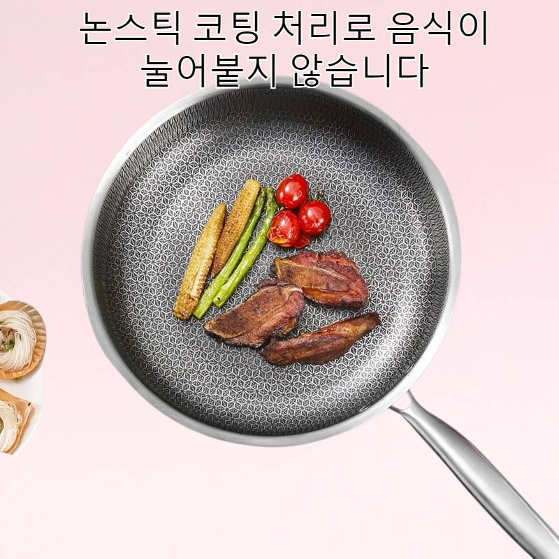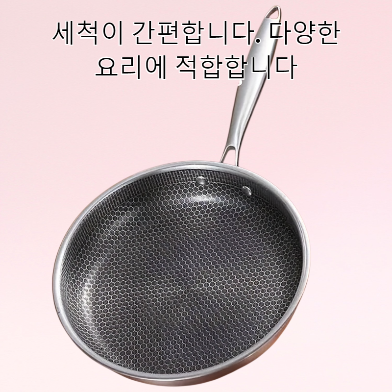 스테인리스 스틸 허니콤 구조로 내구성이 뛰어나며, 논스틱 처리로 음식이 달라붙지 않고 세척이 간편함. 계란, 스테이크 등 다양한 요리에 적합.